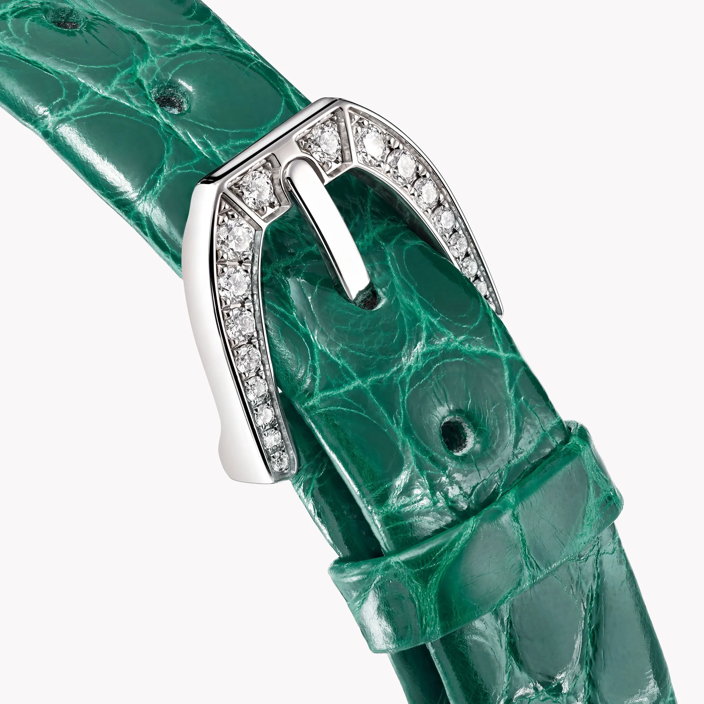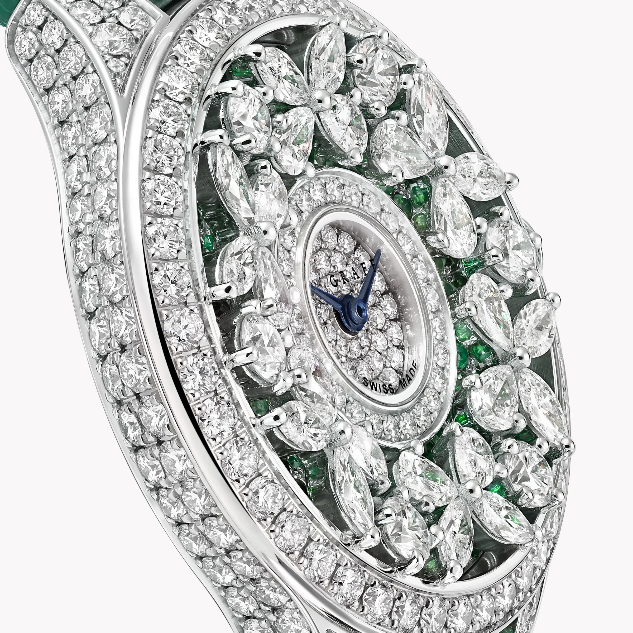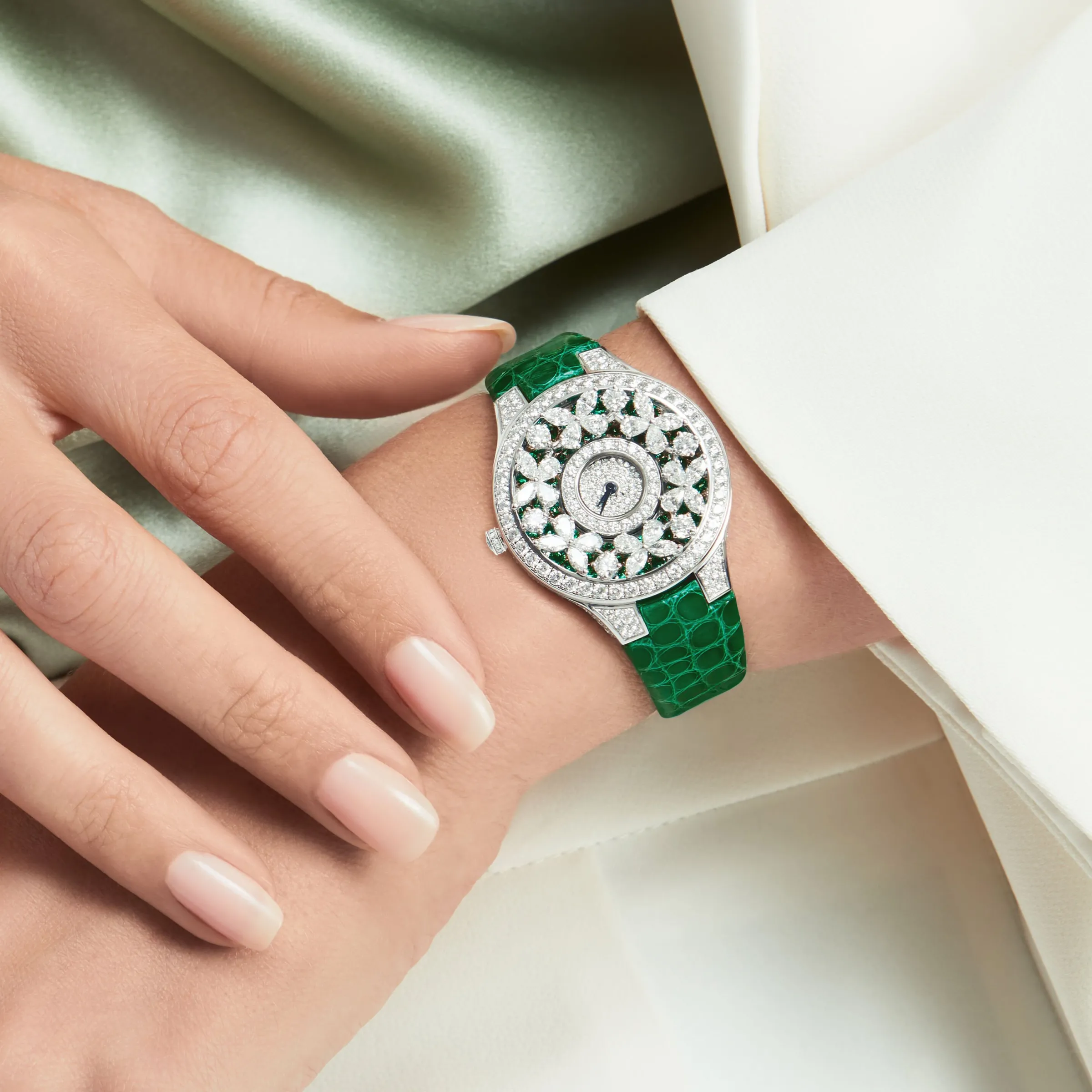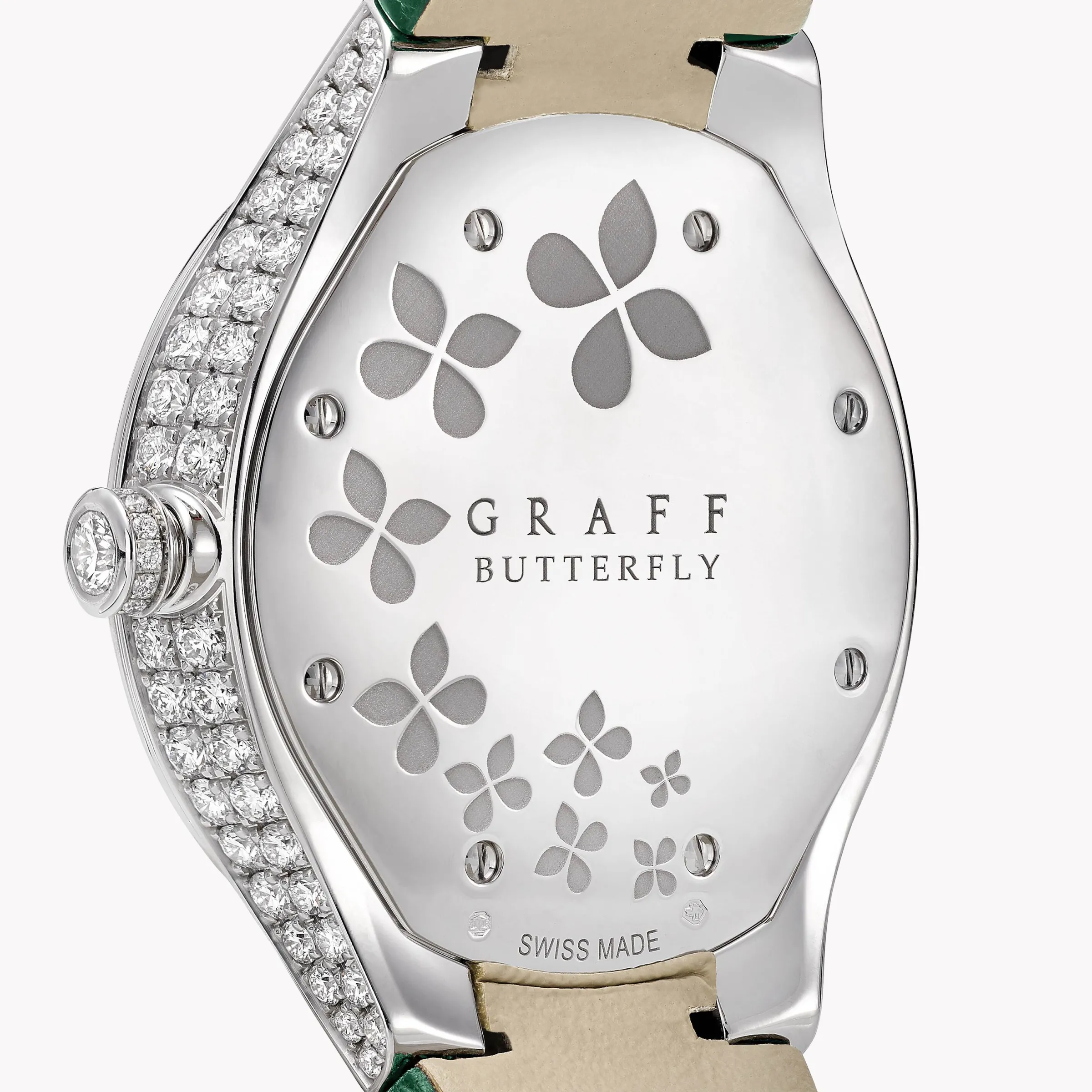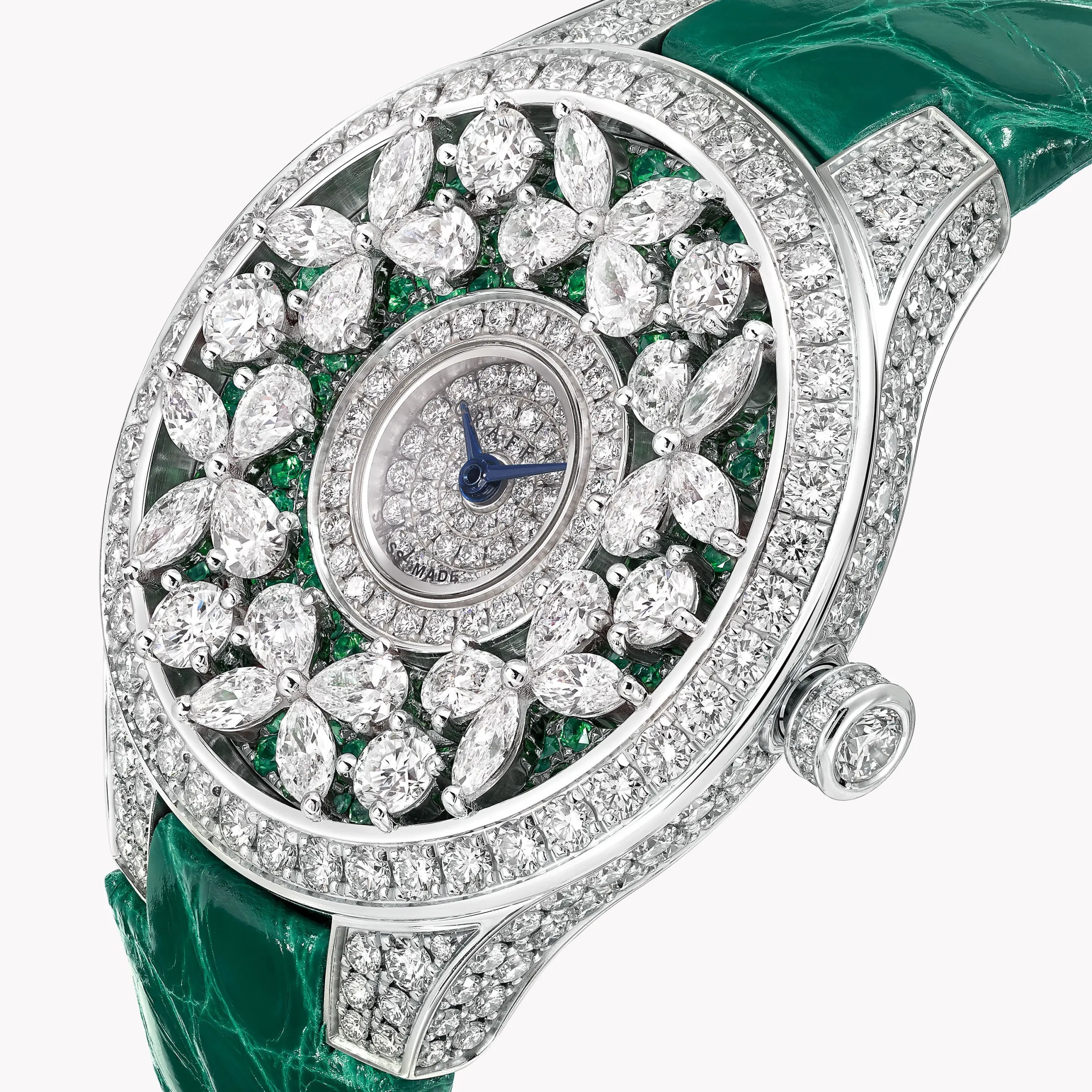 An enchanting Classic Butterfly diamond watch, presented on a green alligator strap, with a total weight of approximately 7.03 carats of diamonds and 1.30 carats of emeralds.