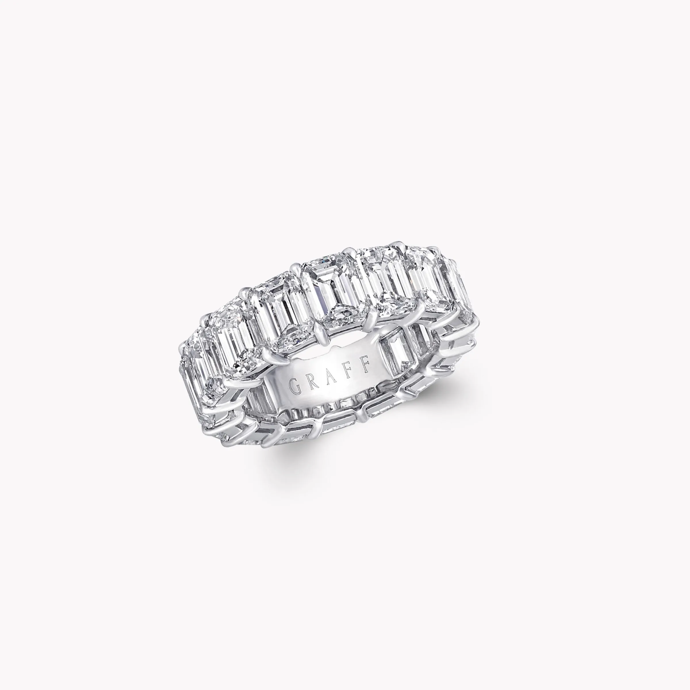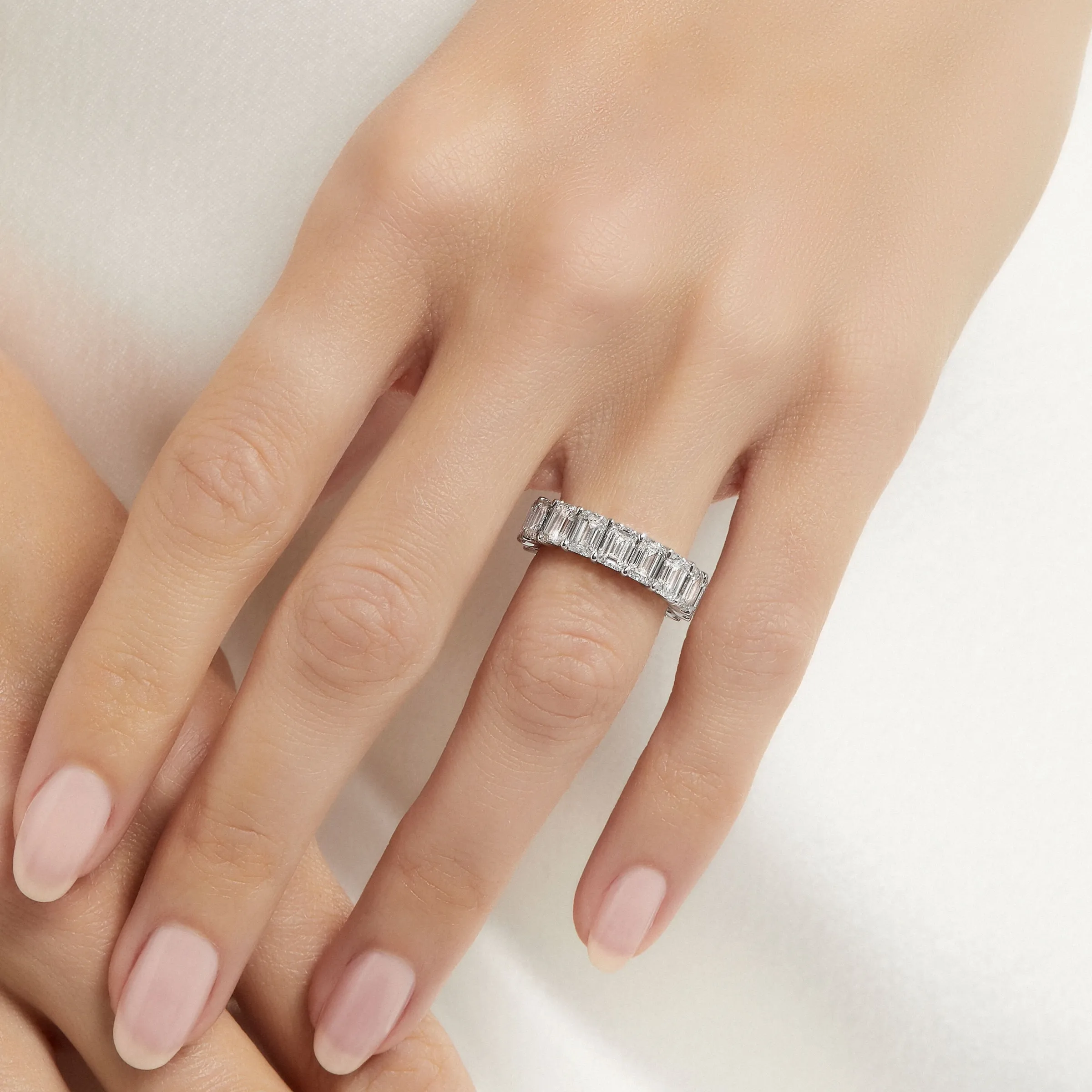 An elegant emerald cut diamond eternity band with a total weight of 7.89 carats, showcasing 0.50 carat emerald cut diamonds.