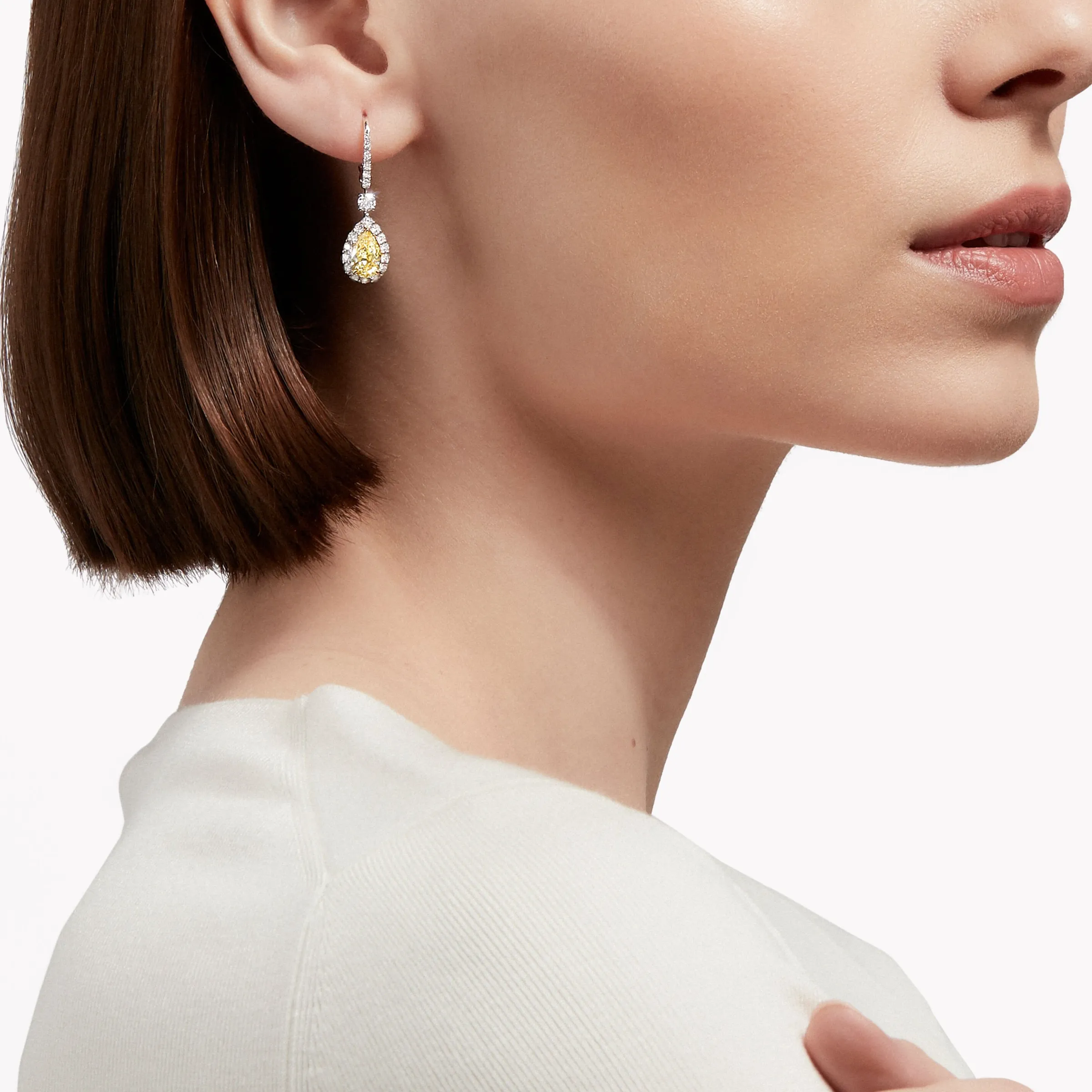 Model wears a vibrant and vivacious pair of Icon pear shape yellow and pavé white diamond earrings with a total weight of 3.41 carats, showcasing two certified Fancy Yellow pear shape diamonds weighing more than 1.00 carats each.