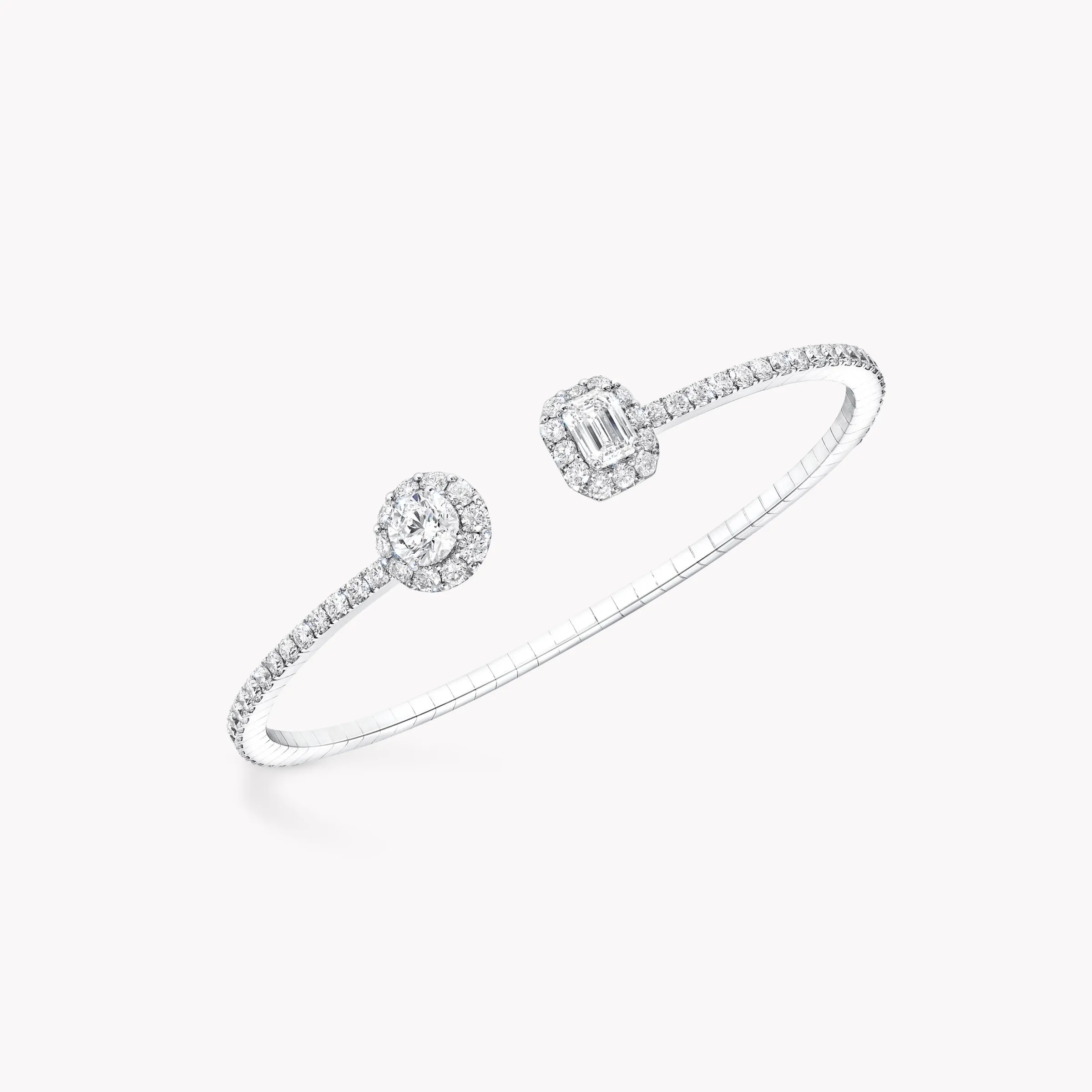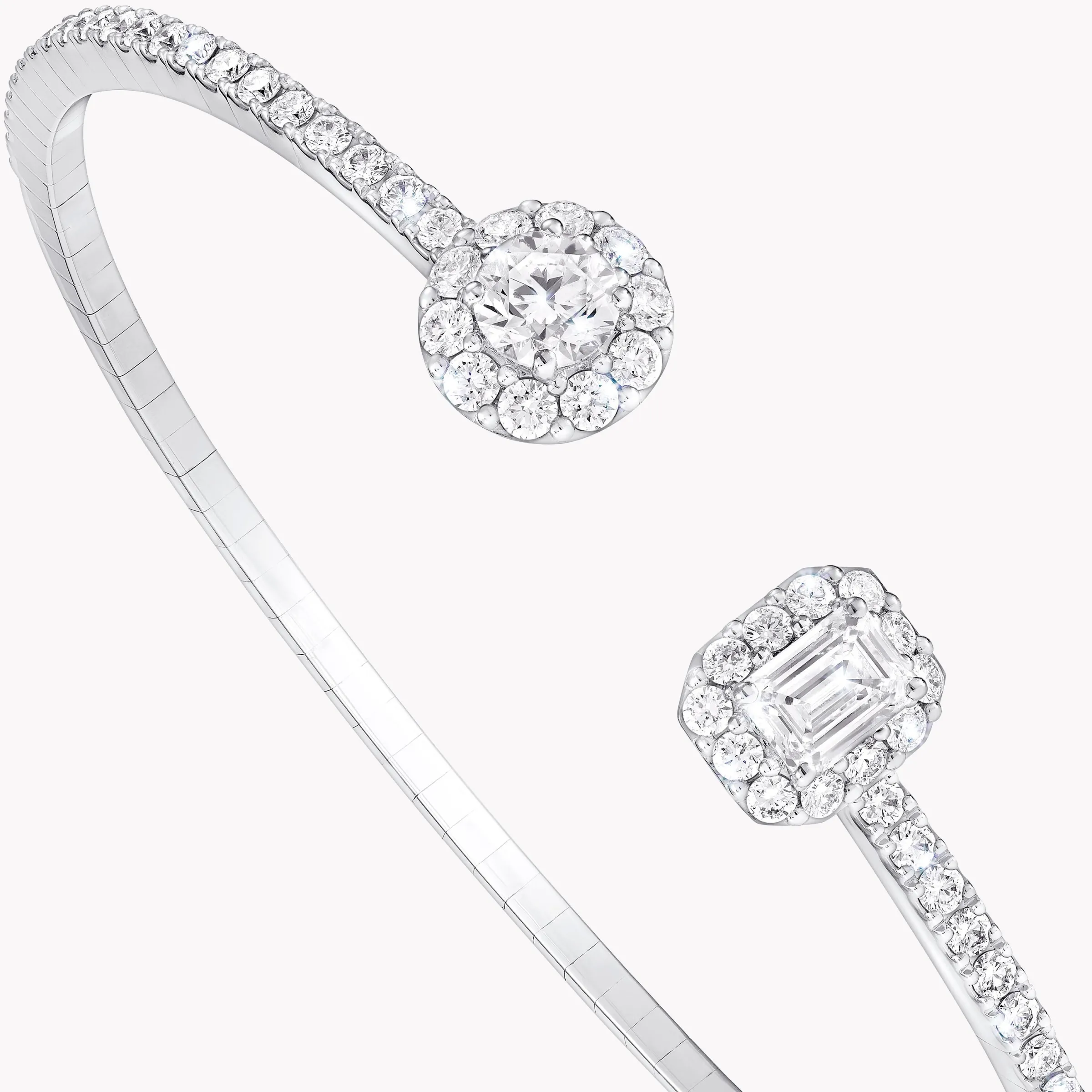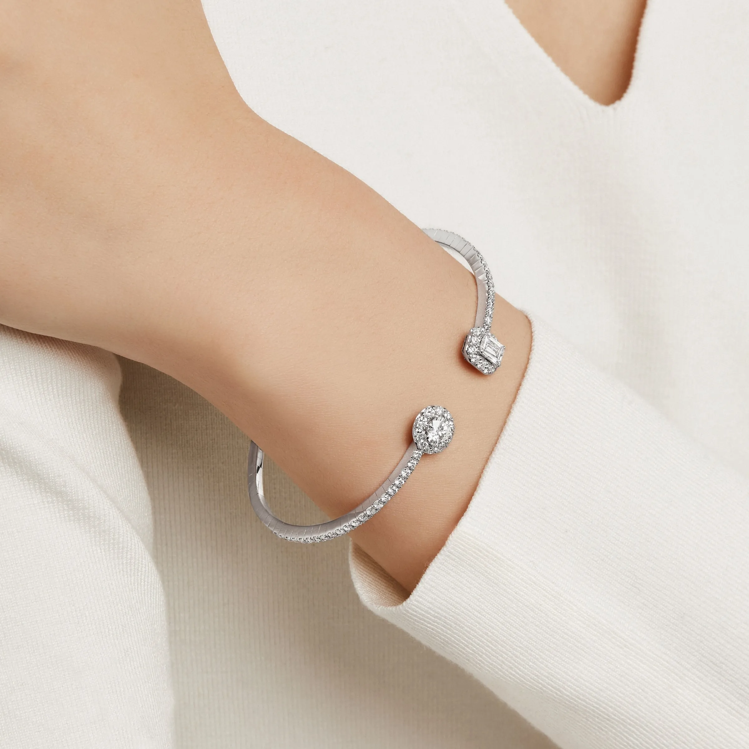 Model wears a mesmerising Icon round and emerald cut diamond bangle with a total weight of 3.67 carats, showcasing a certified 0.80 carat round and 0.75 carat emerald cut diamond.