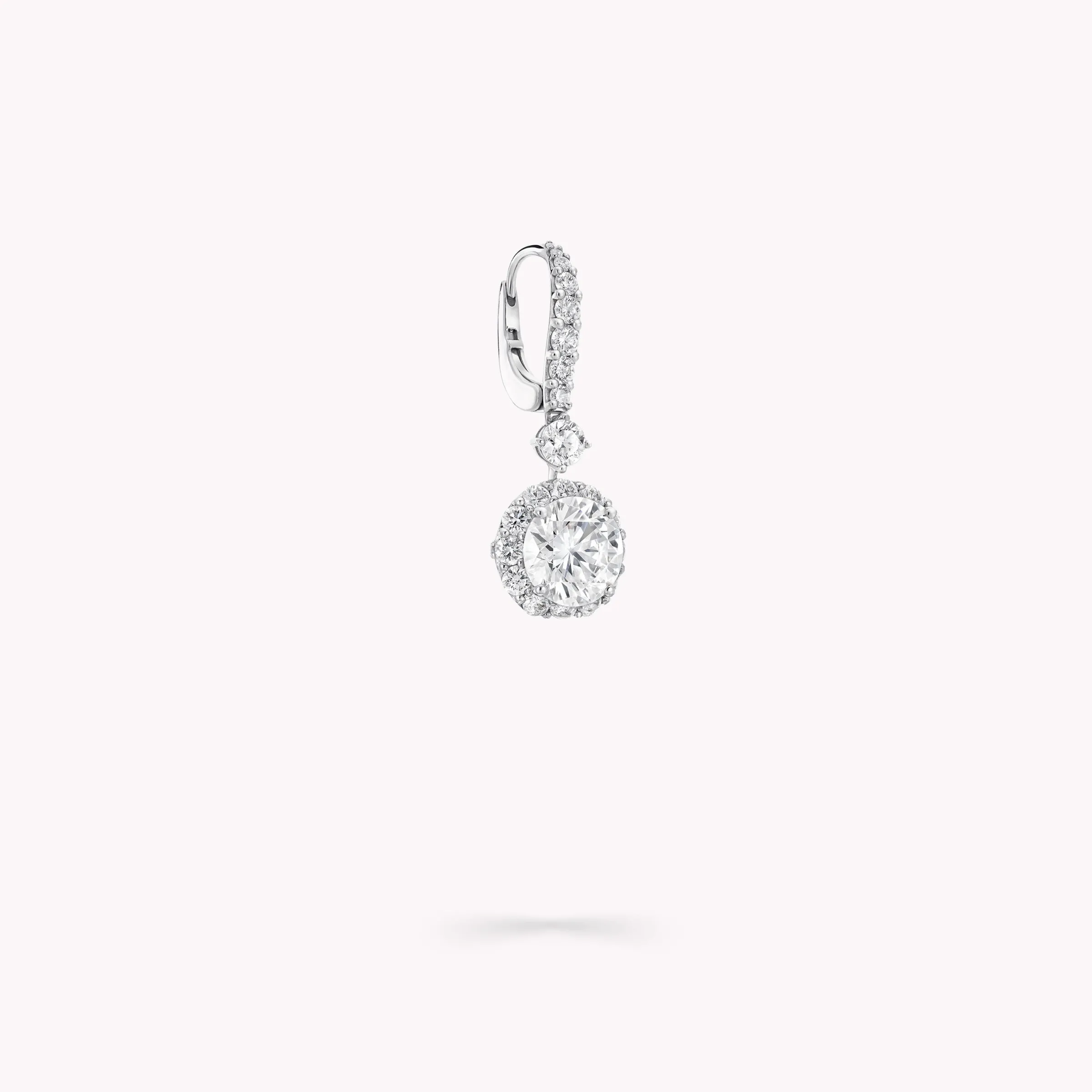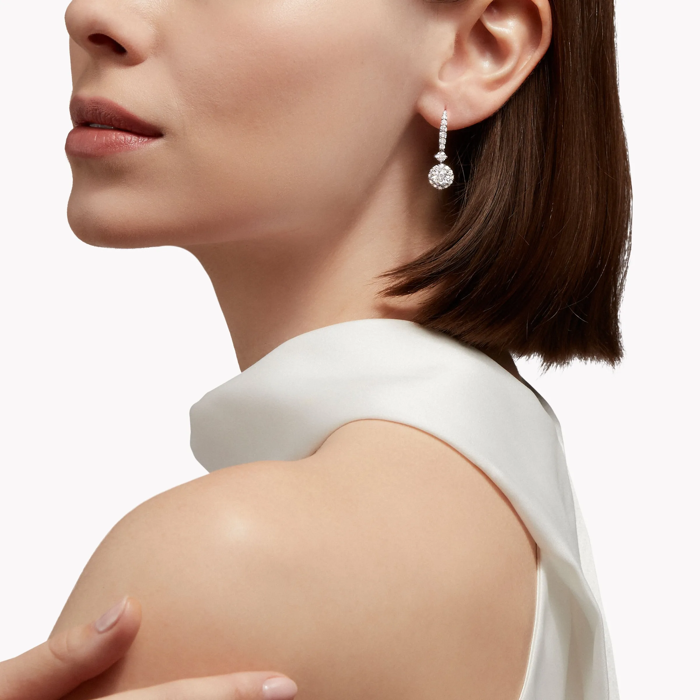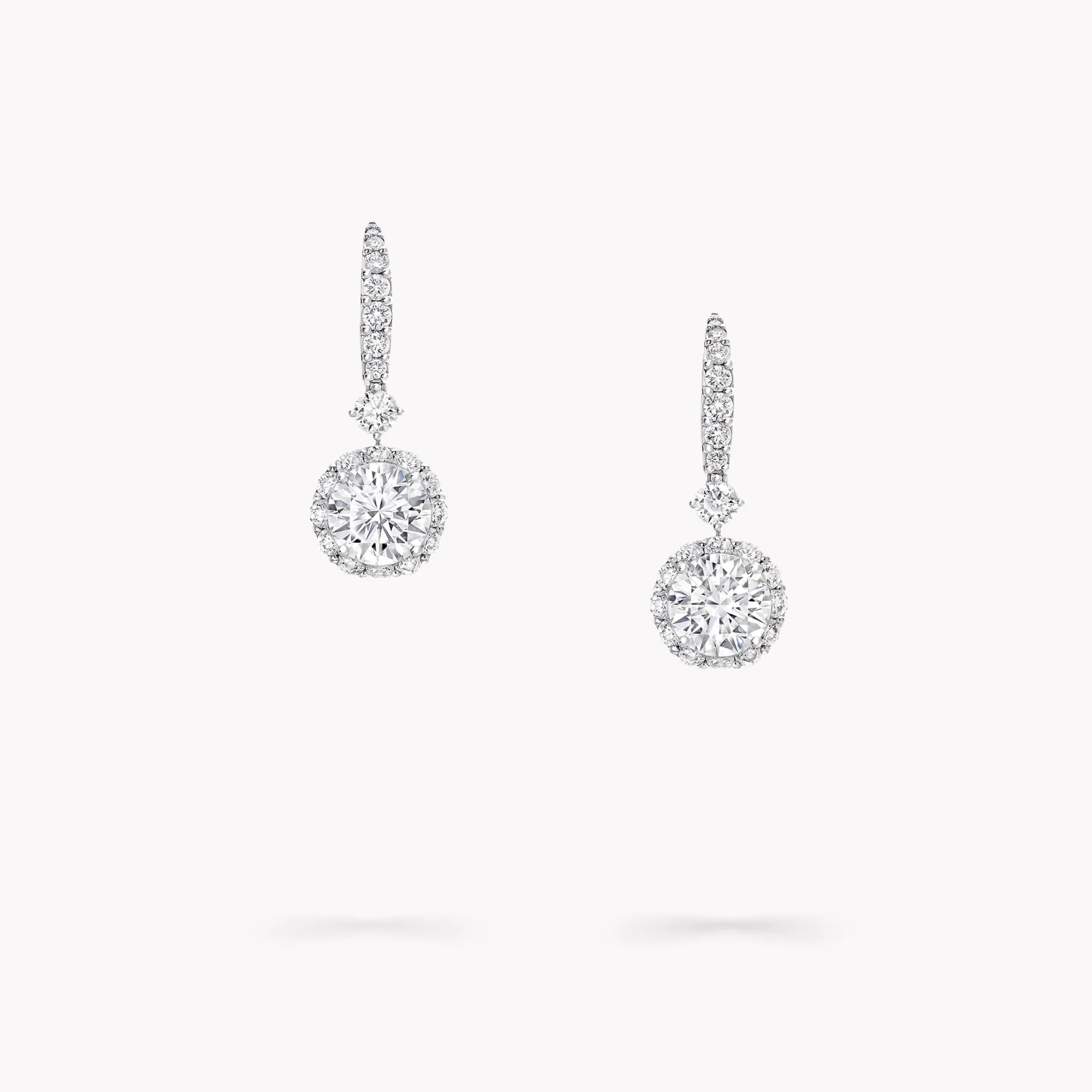 Suspended from a precise line of pavé diamonds, set upon delicately crafted white gold French wire, the slender setting and halo effect of the diamond drops serve to amplify their brilliance: the ultimate display of virtuosity, captured in a timelessly elegant design.