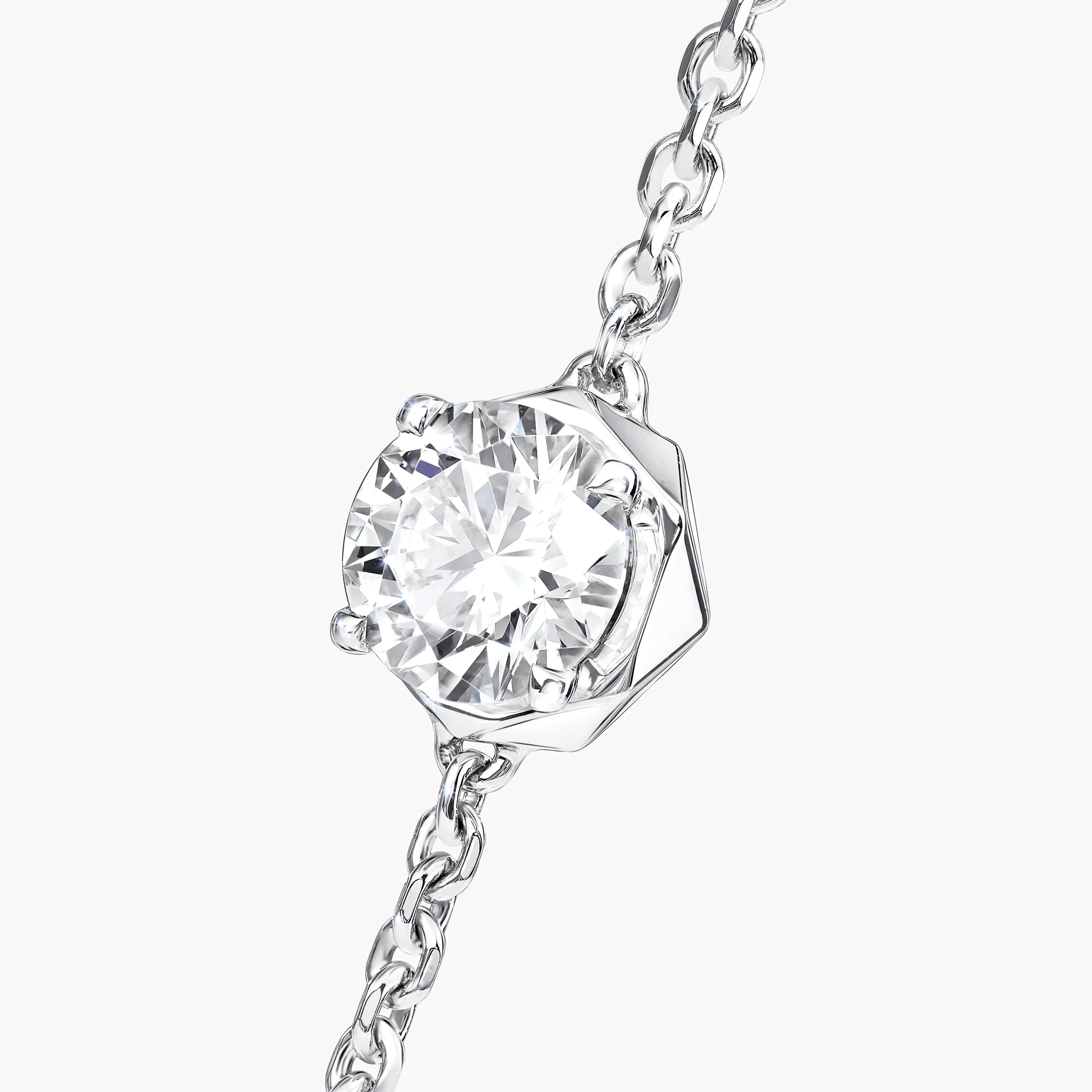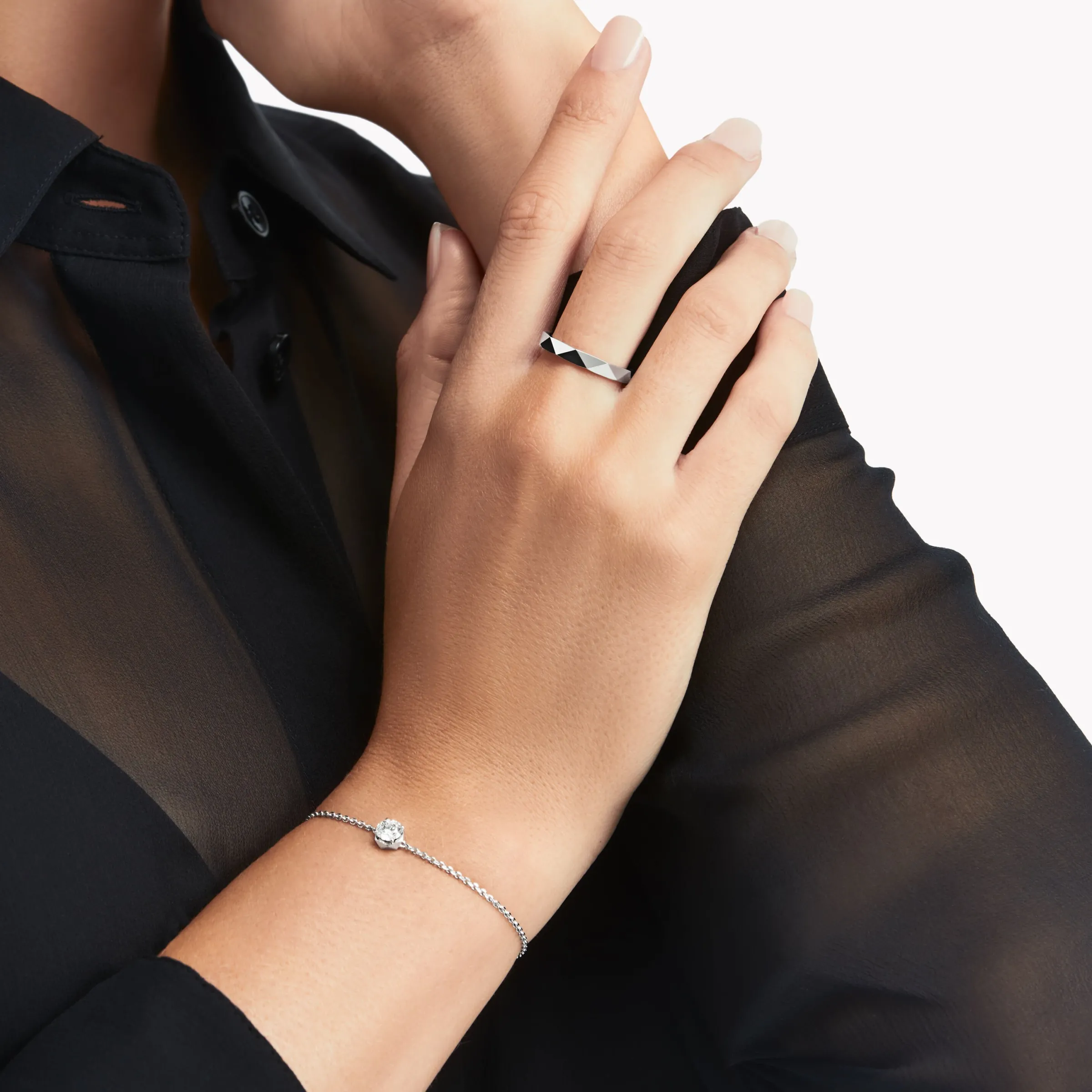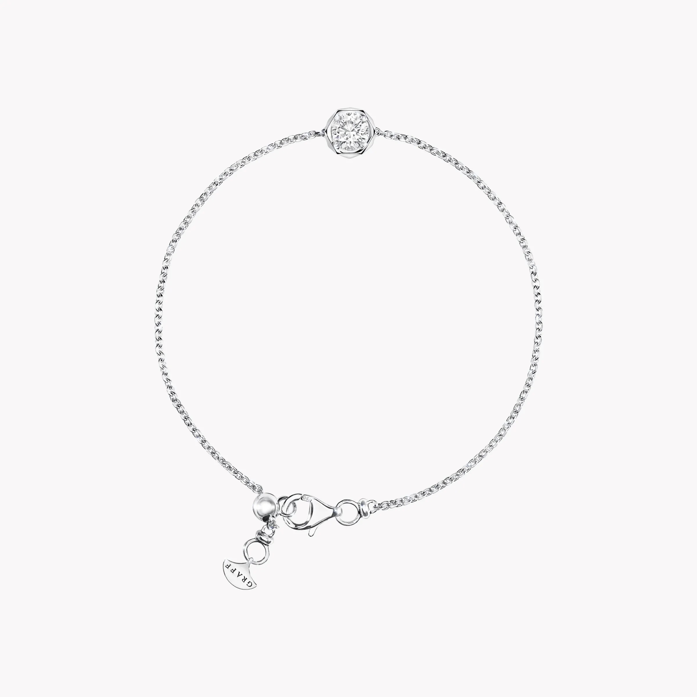 Model wears an elegant Laurence Graff Setting round diamond bracelet showcasing a certified 0.50 carat round diamond.