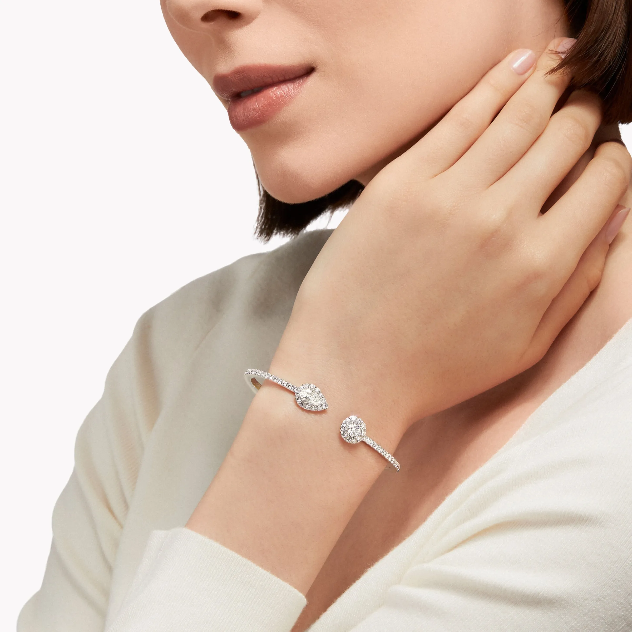 Model wears a mesmerising Icon round and pear shape diamond bangle with a total weight of 3.48 carats, showcasing two certified 0.70 carat pear shape round diamonds.