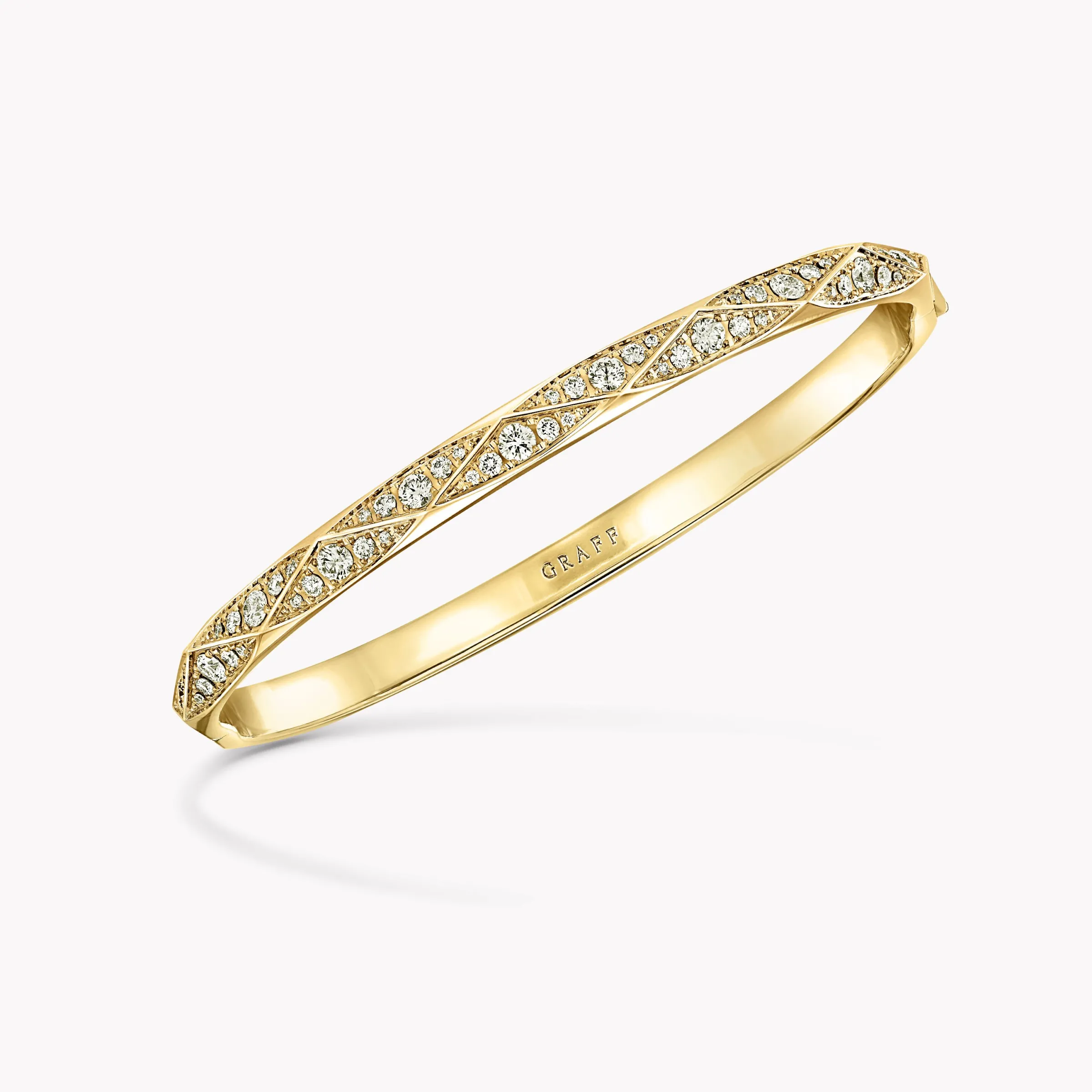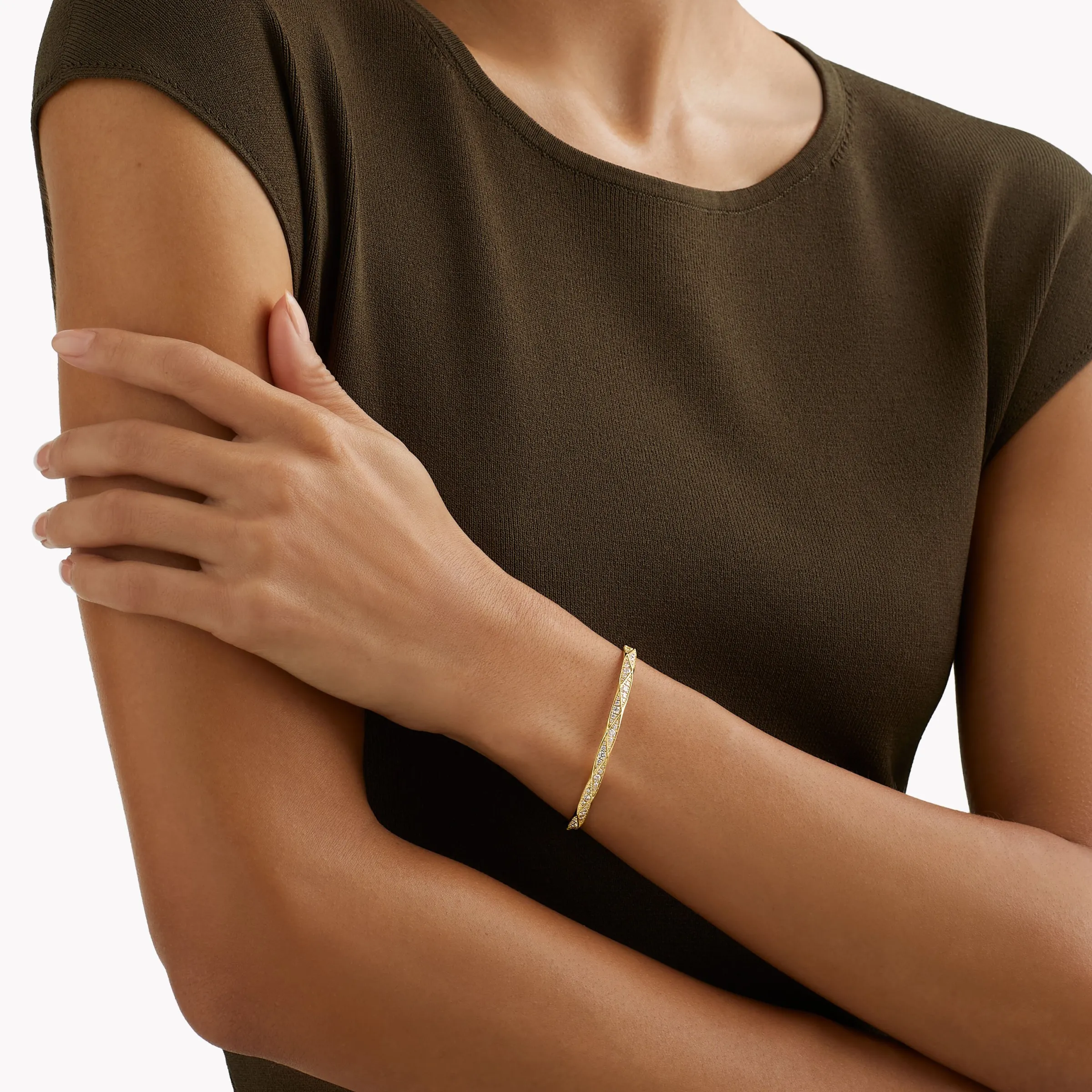 Model wears a charming Laurence Graff Signature pavé diamond and yellow gold bangle in size 17cm, with a total approximate diamond weight of 0.98 carats.