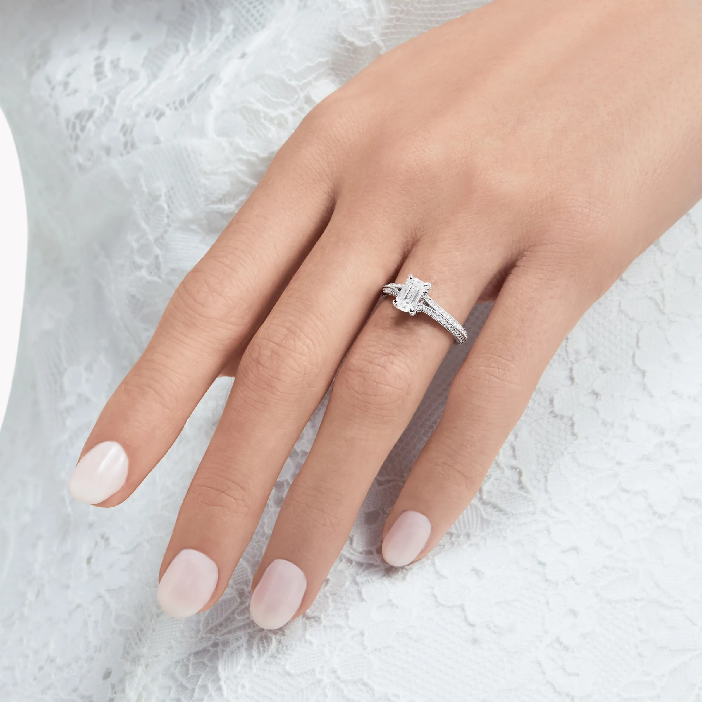 Model wears a sleek and elegant Legacy engagement ring with a total weight of 1.19 carats, showcasing a certified 0.73 carat emerald cut diamond and pavé diamond band.